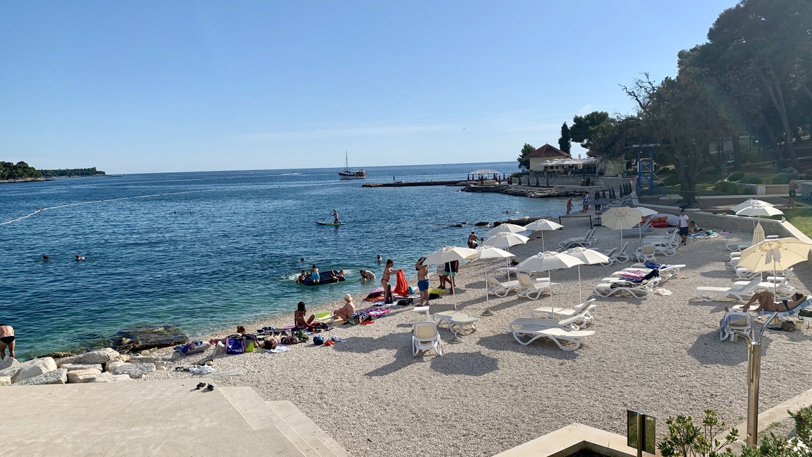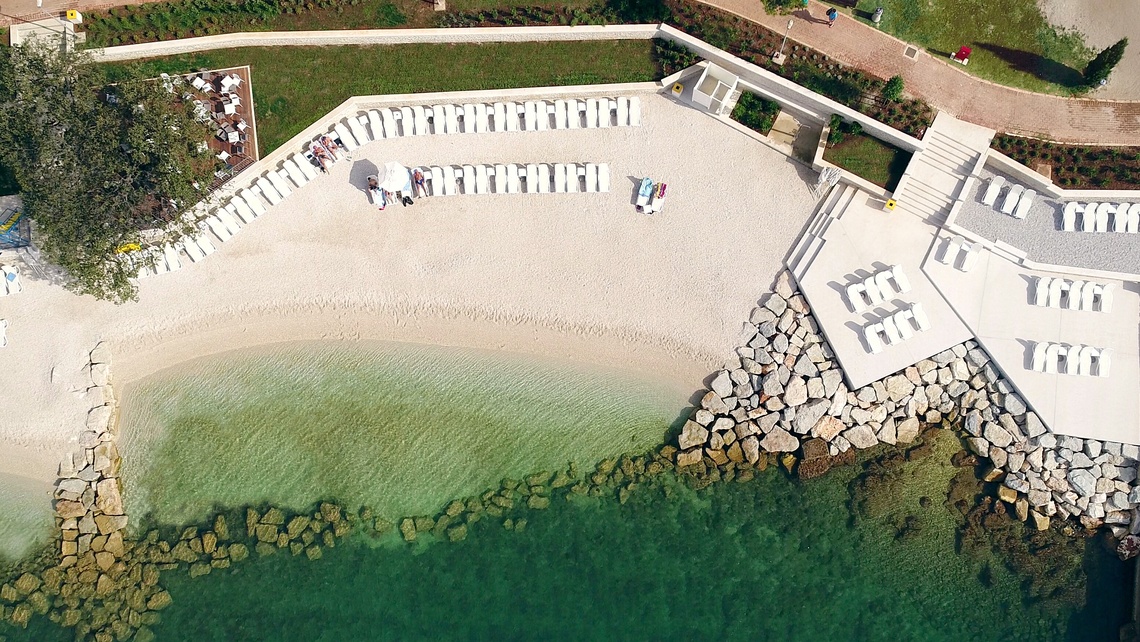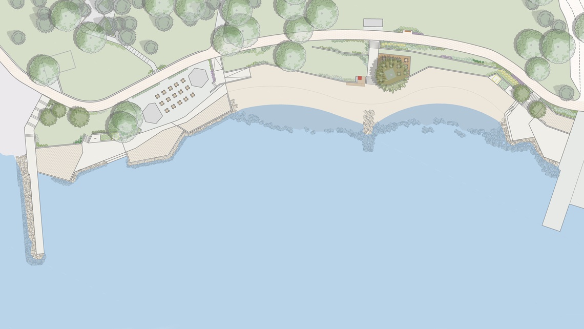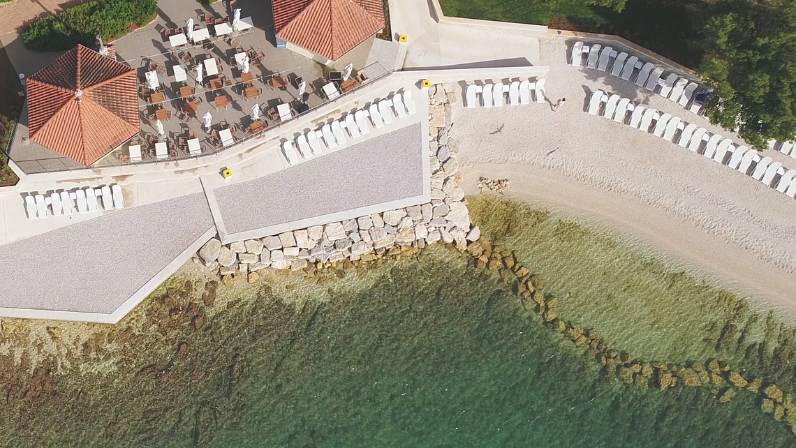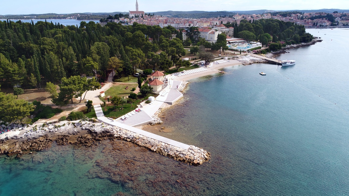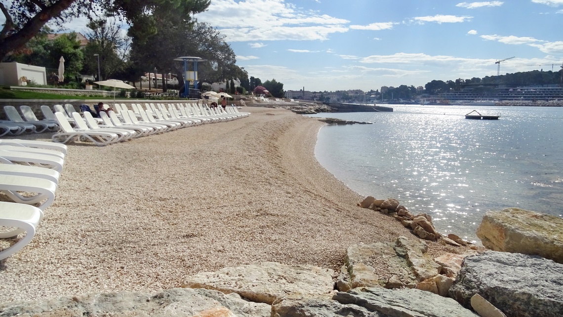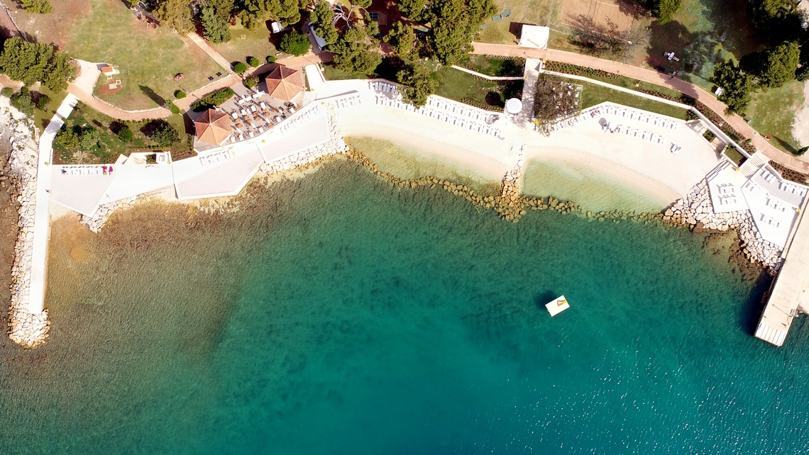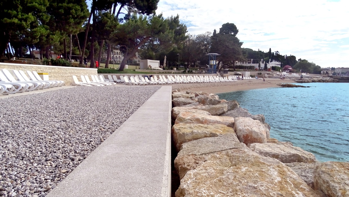 Uređenje plaže na otoku Sv. Katarina, u neposrednoj blizini starogradske jezgre Rovinja, temelji se na potrebi da se plaža vizualno uklopi u prirodni ambijent u kojem se nalazi te da istovremeno pruži najviši standard uređenja i opremljenosti. Suvremeno oblikovanje nenametljivo koegzistira s postojećim prirodnim elementima i građenim strukturama. Prostoru daje prepoznatljivost, povećava funkcionalnost i sigurnost plaže te korisniku omogućava različite doživljajne kvalitetne aktivne i pasivne maritimne rekreacije.