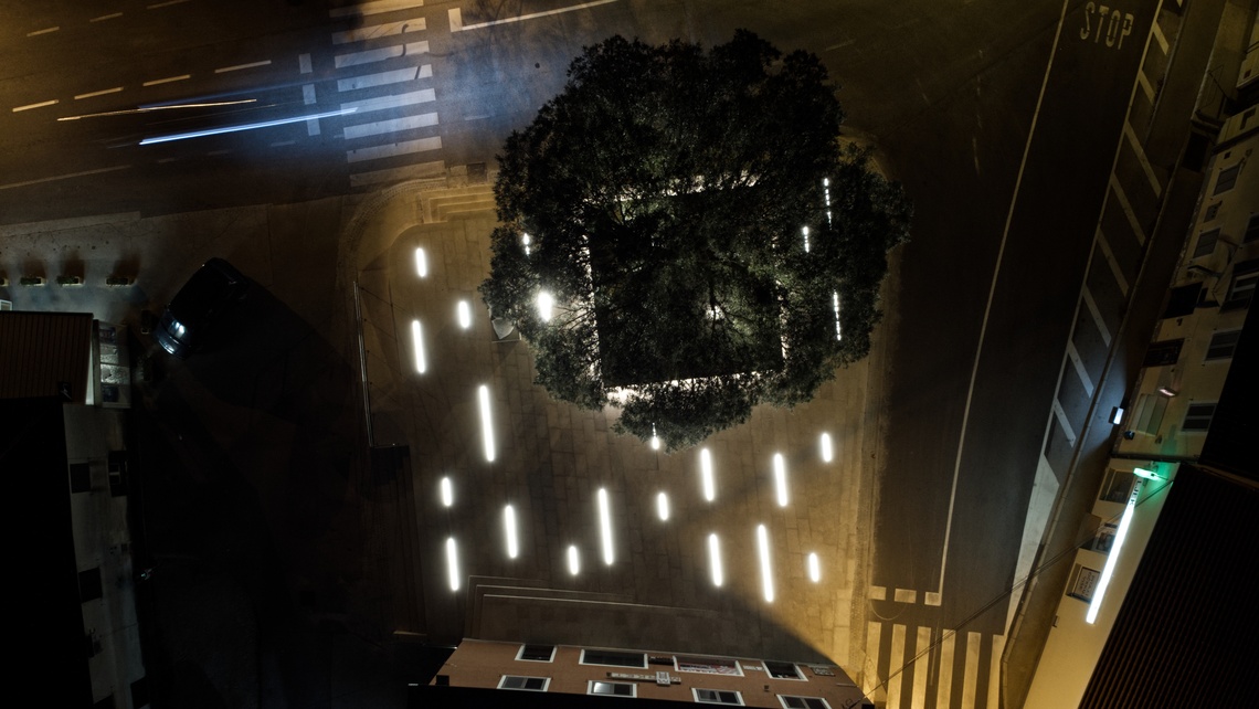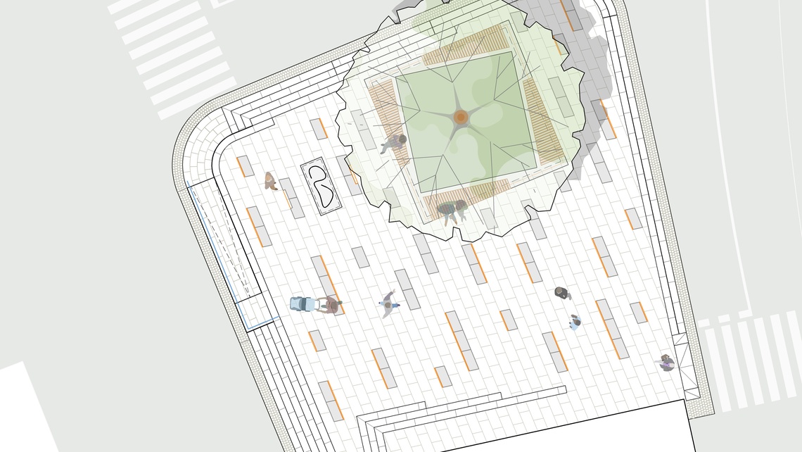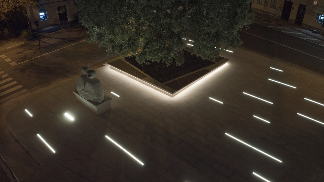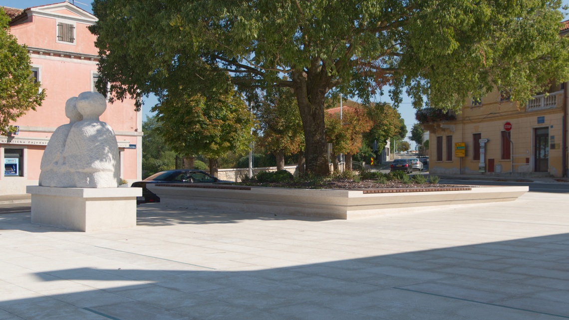 Novim uređenjem centralnog trga u Kanfanaru osiguralo se povećanje korisnog prostora trga uz naglašavanje njegovih glavnih elemenata – impozantne ladonje te skulpture 'Dvije grlice' koja je prikladnije pozicionirana te istaknuta osvjetljenjem. Oko stabla formirana je zaštitna opna od lokalnog kamena s funkcijom klupe koja omogućava neformalno sjedenje te sagledavanje okoline u sva četiri pravca. Promišljenim denivelacijama obodnih stepenica stvoren je suptilan spoj s kontaktnim terenom te omogućen je lak pristup svim korisnicima. U večernjim satima trg dobiva novo ruho odmjerenom, ali upečatljivom linijskom ambijentalnom rasvjetom inkorporiranom u tijelo klupe i kameno opločenje partera.