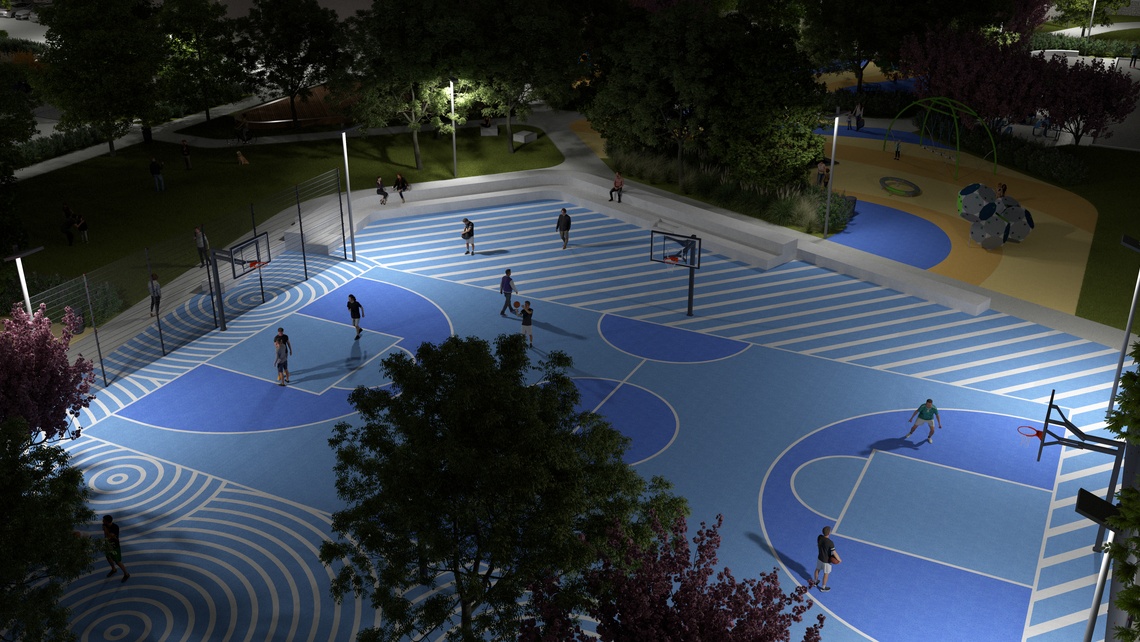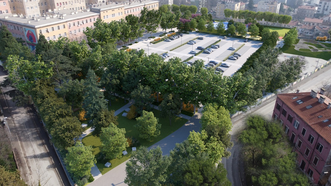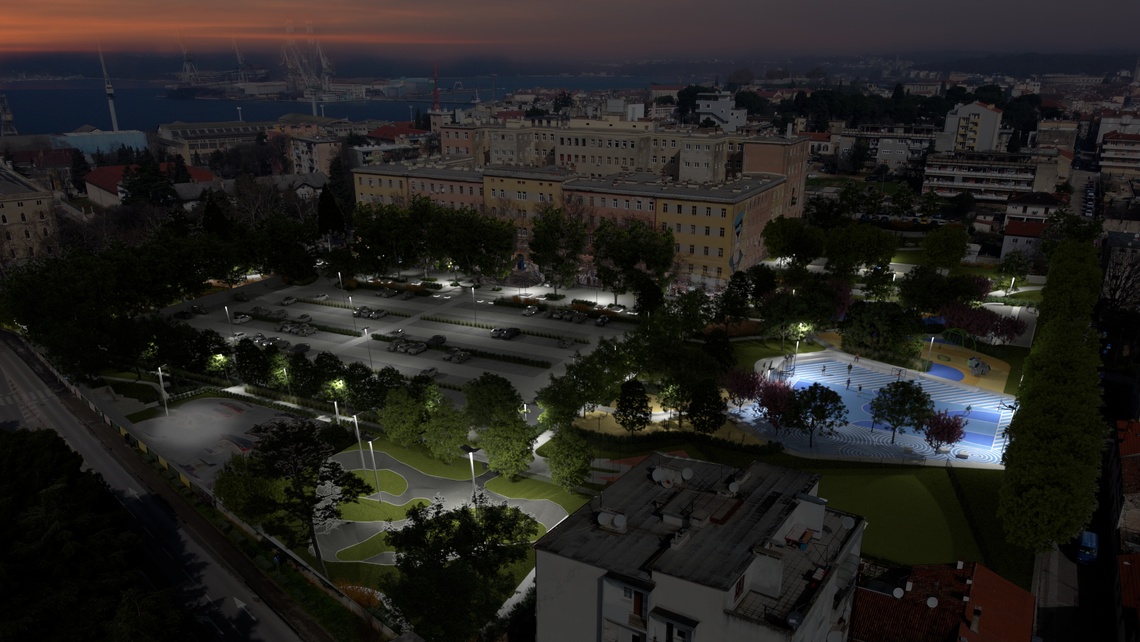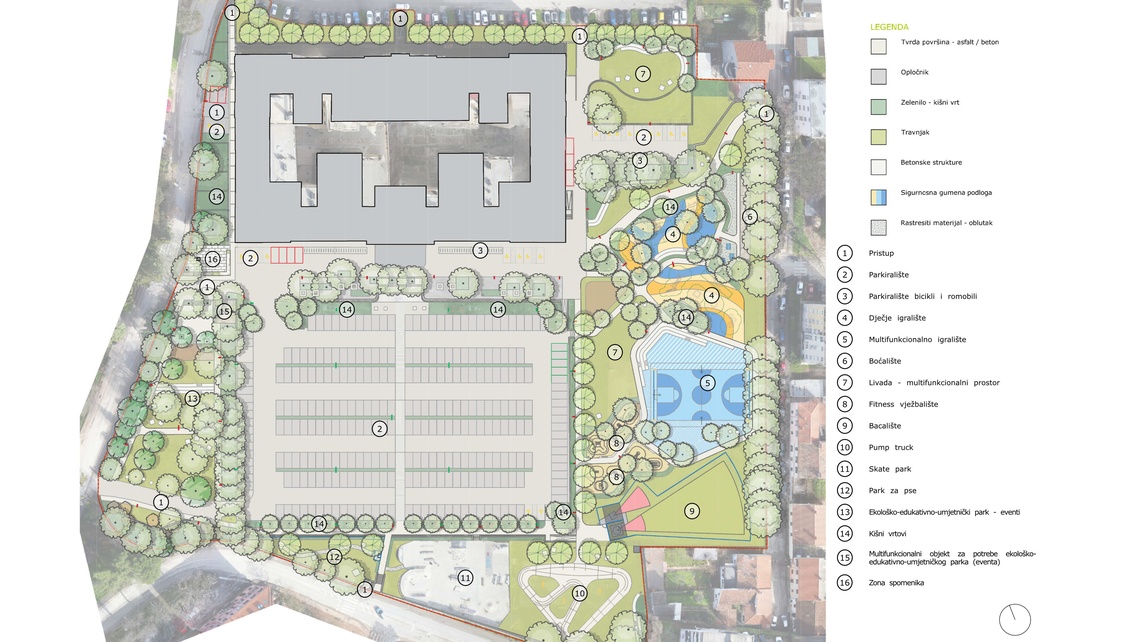 Svi elementi rješenja integrirani su funkcionalno i oblikovno u skladnu cjelinu koja čuva postojeće prirodne vrijednosti u prostoru – očuvan je velik broj visokovrijednih stabala u urbanom prostoru, promiču se suvremene ekološke prakse i koncept zelene infrastrukture – održiva odvodnja, zamjena nepropusnih površina propusnim materijalima, sadnja stabala prilagođenih posljedicama klimatskih promjena te se pruža ambijent u kojem se odvijaju i njeguju edukativne, sociološke i kulturne aktivnosti šire zajednice.